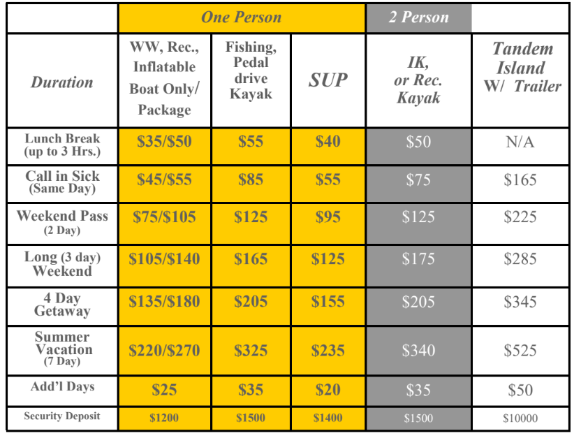 Lunch Break Rental: Any boat rental up to 3 hours. First come, first serve basis; no reservations will be taken. Any time over three hours will be assessed $10 for the boat only, or $15 for the package.