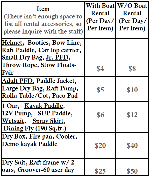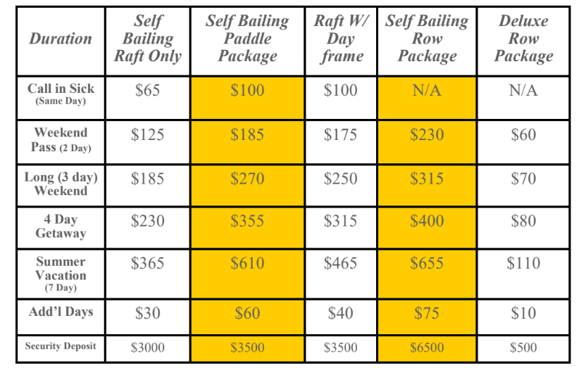 Deluxe Row Package: Includes all row package items plus; your choice of 2 of the following: 60 user day groover, 2 large dry bags, fire pan, dining fly, dry box, cooler, Rolla-table, Rolla-Cot, Paco Pad, drysuit.